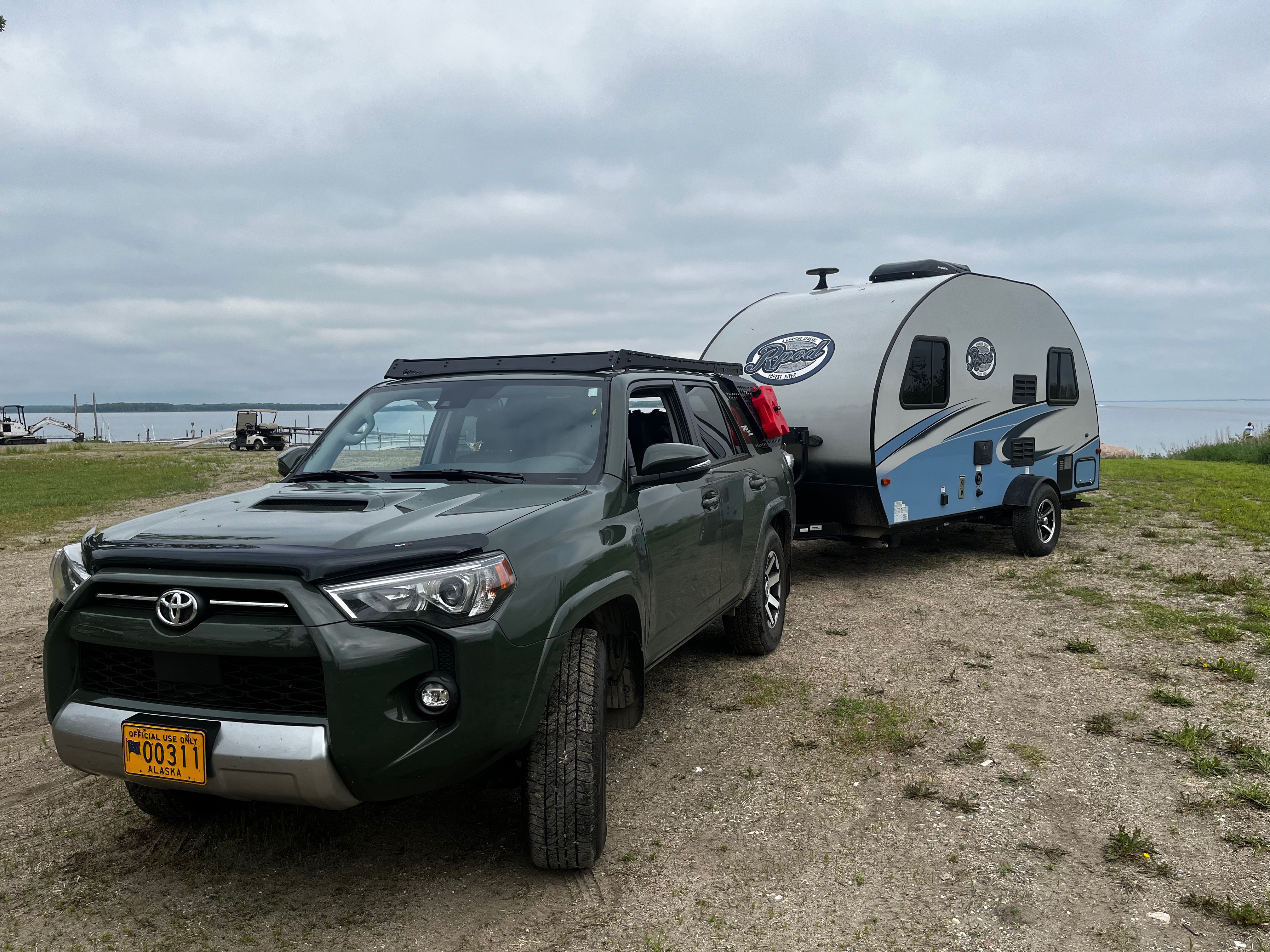 We saw our first pronghorn, drove past the geographical center of North America (not the lower 48; but the continent), then learned the difference between an RV campground and an RV park. We stayed at Eastbay Campground and RV Park in Warwick, ND. I hadn’t realized that an RV park was more of a long-term type of place. We were on a grass site (not bad, but difficult to level on), the bathroom was about 0.5 mile walk away with no close outhouse, and it was golfcart central. But, we were right on the lake and it was only for one night.