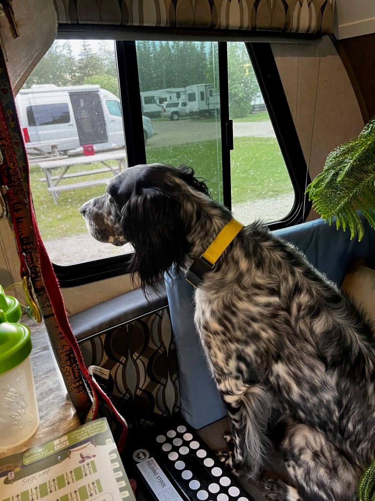 It was another long driving day. We going from Coutts to Whitecourt, AB. It was 460 miles (740 km) which would take approximately 7 hours and 22 minutes driving the speed limit and non-stop. Add on bio-breaks, fuel stops, driving a bit slower hauling the trailer, and then the rain. Not just a little rain. Downpours. Our Gold Springs campground neighbor had warned us the night before that heavy rains were coming and were expected to be in the area for three days. We needed to get north of it.