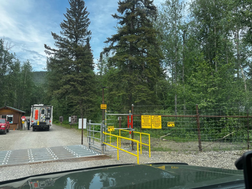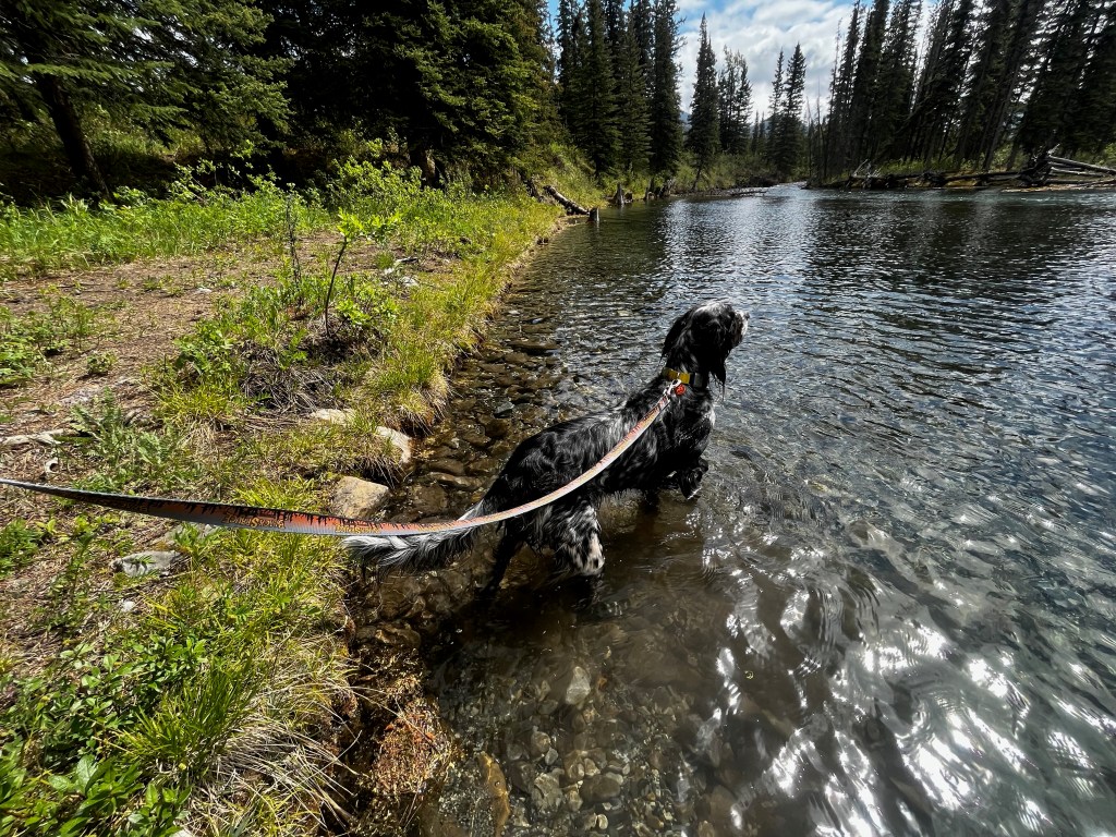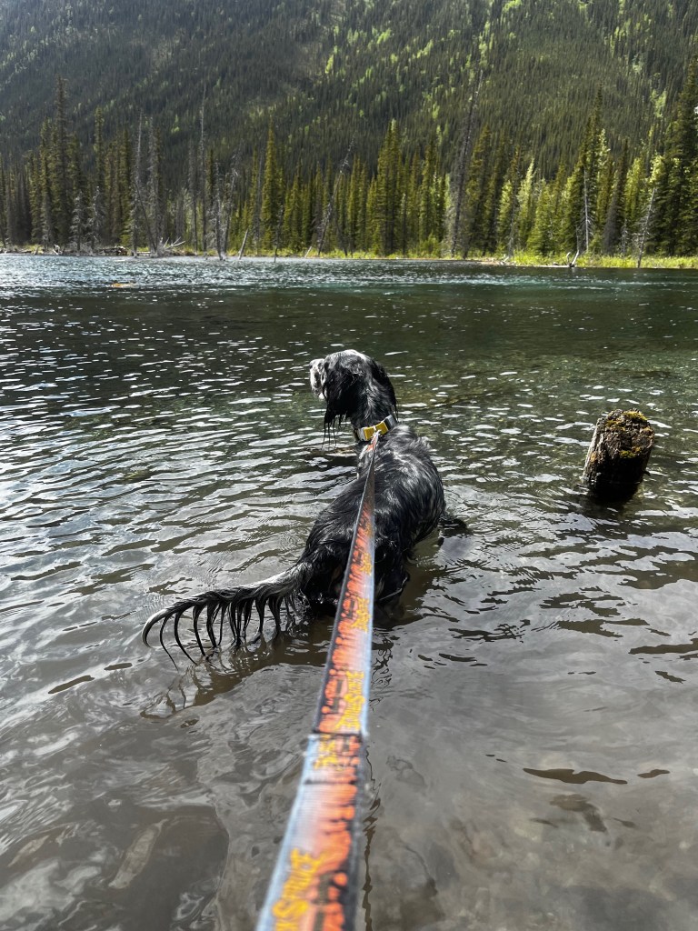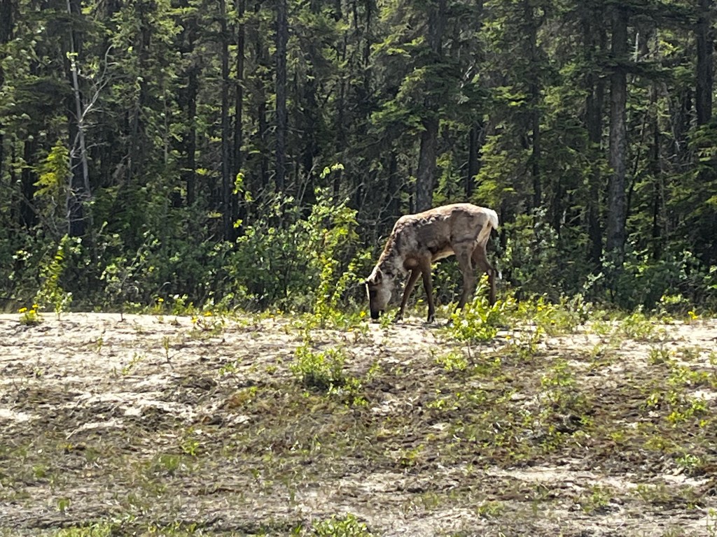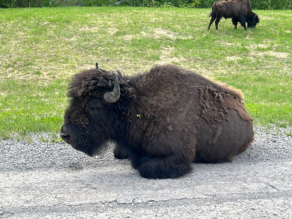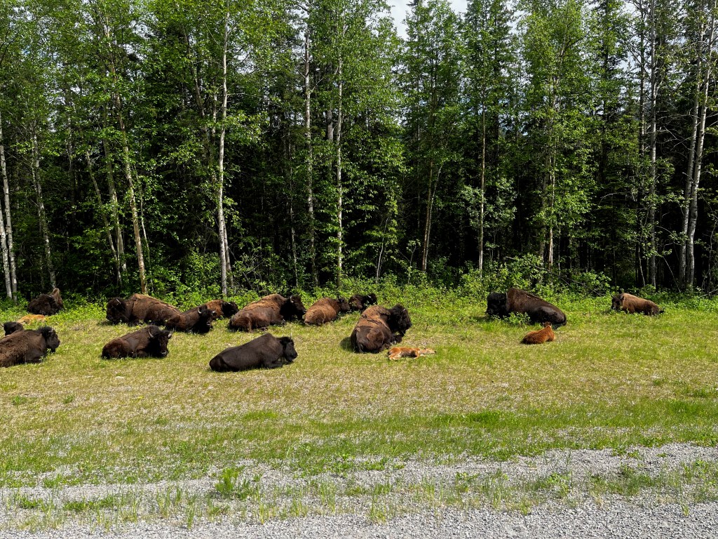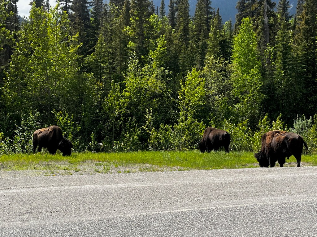We took our time getting to Muncho Lake, stopping to cast a line, walk the girls, and enjoy the drive. Clemmie decided to take a swim in the ice cold water (silly girl). We pulled up to Northern Rockies Lodge late in the afternoon, checked in, booked dinner reservations, dropped the camper trailer, and headed the 45 minutes up to Liard Hot Springs. We saw wood bison herds on the way to and from Liard along and in the road, caribou and mountain goat. Liard Hot Springs Provincial Park had a reverse Jurassic Park feel to it. The park is surrounded by an electric fence such that the humans are the ones who are fenced in. We had a nice soak in the springs and headed back for a delicious supper.